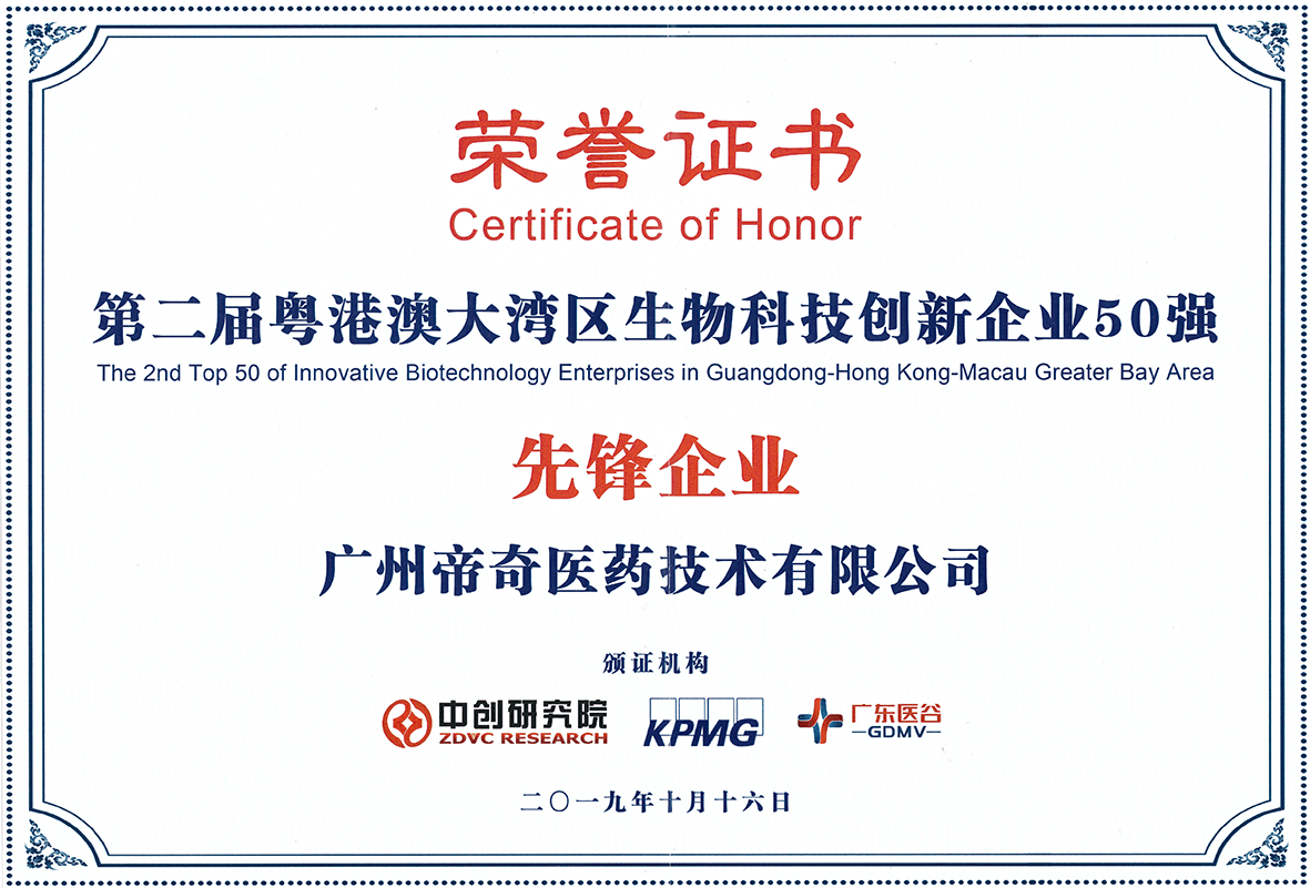 10月,获得第二届粤港澳大湾区生物科技创新企业50强先锋企业称号。